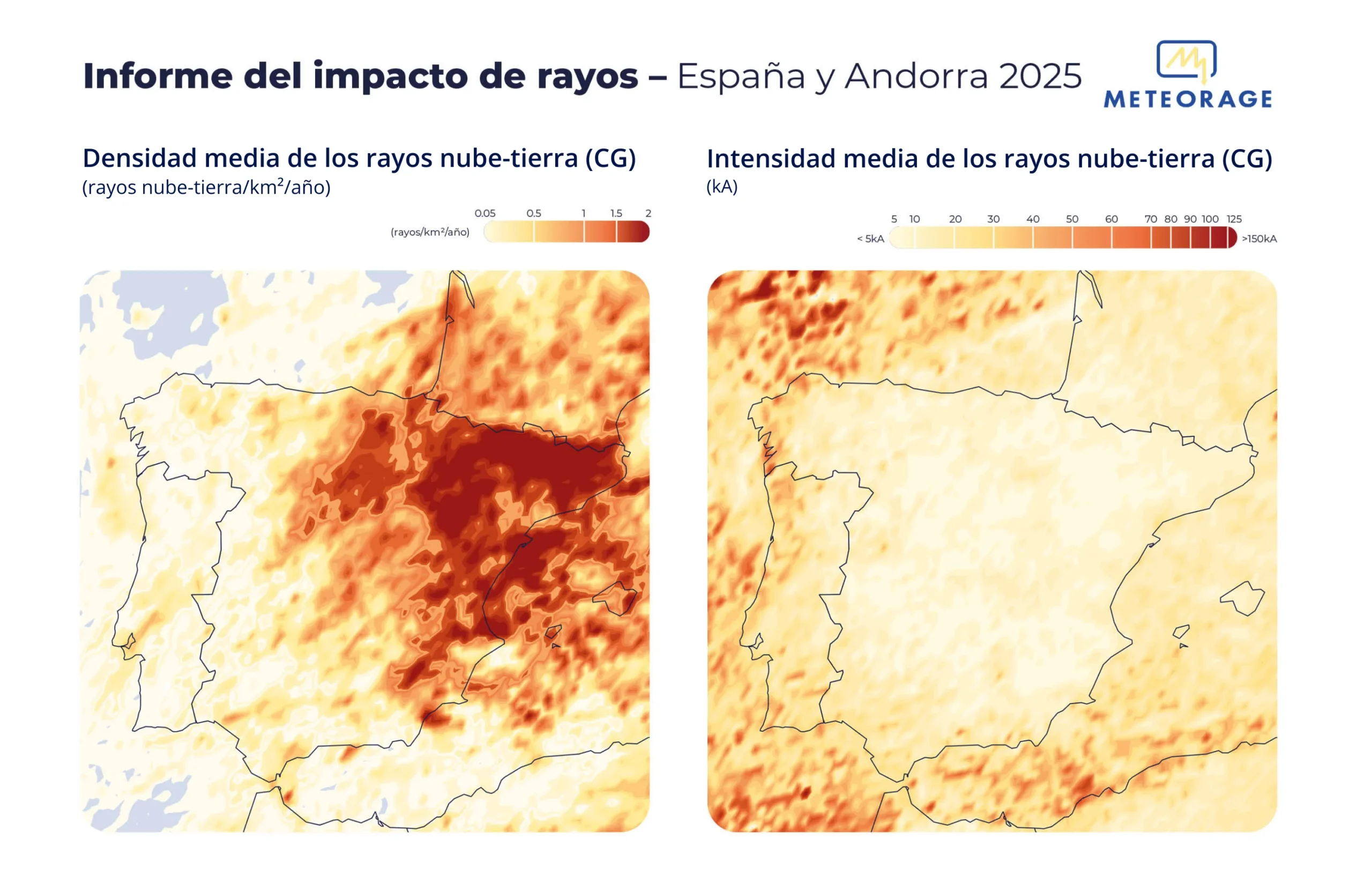 L’année 2025 en Espagne se distingue par une activité foudre élevée, avec environ 427 000 éclairs nuage-sol détectés, l’une des années les plus foudroyées depuis le début de nos relevés.