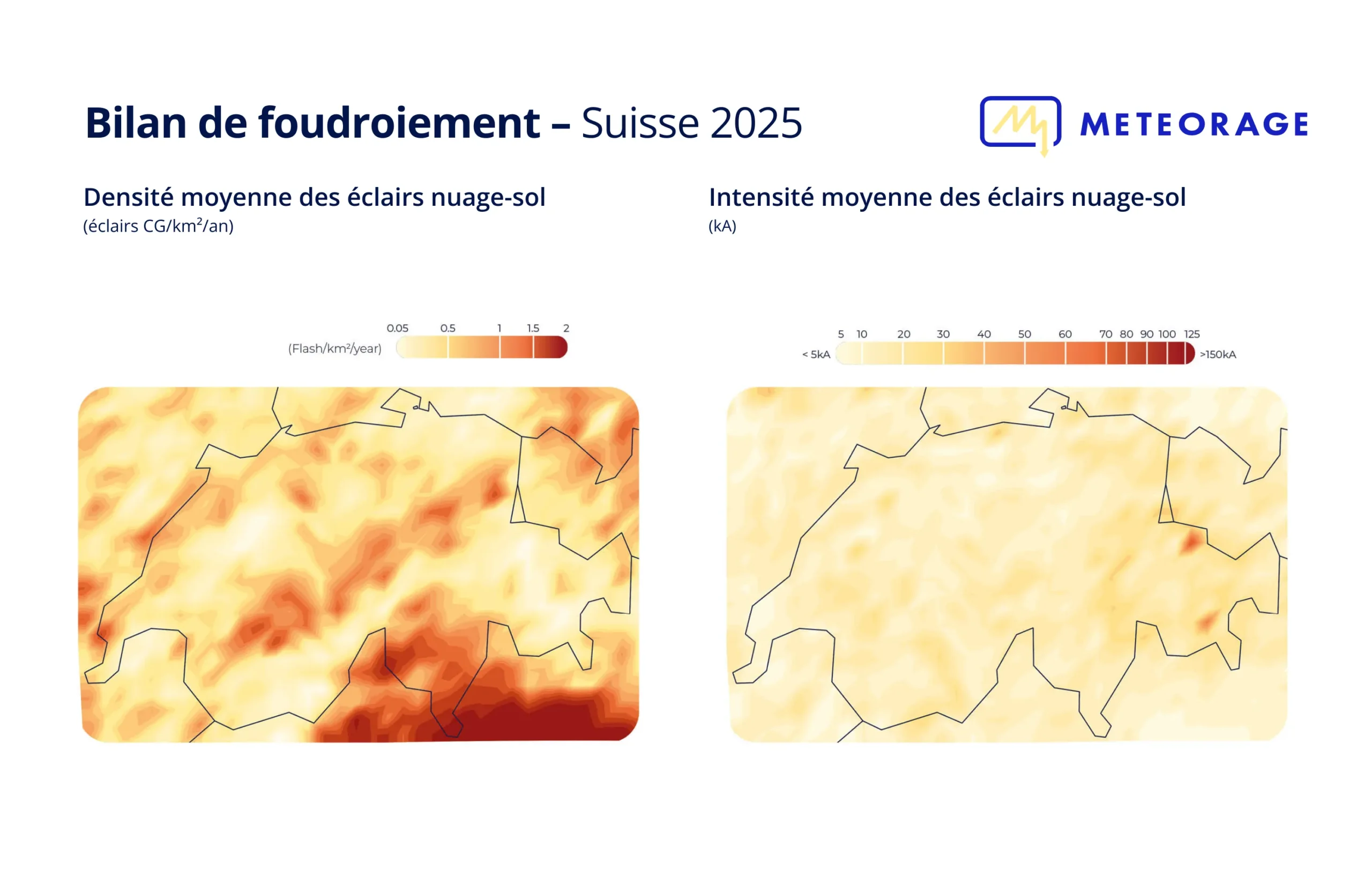 Ces valeurs contrastent avec l’année 2024, au cours de laquelle plus de 1 967 112 éclairs nuage-sol avaient été détectés en Europe, dont 50 075 en Suisse, traduisant une activité conforme aux normales climatiques. Là où 2024 avait été marquée par plusieurs épisodes orageux étendus et structurés, 2025 se distingue par des épisodes plus ponctuels, mais pouvant se révéler localement intenses.