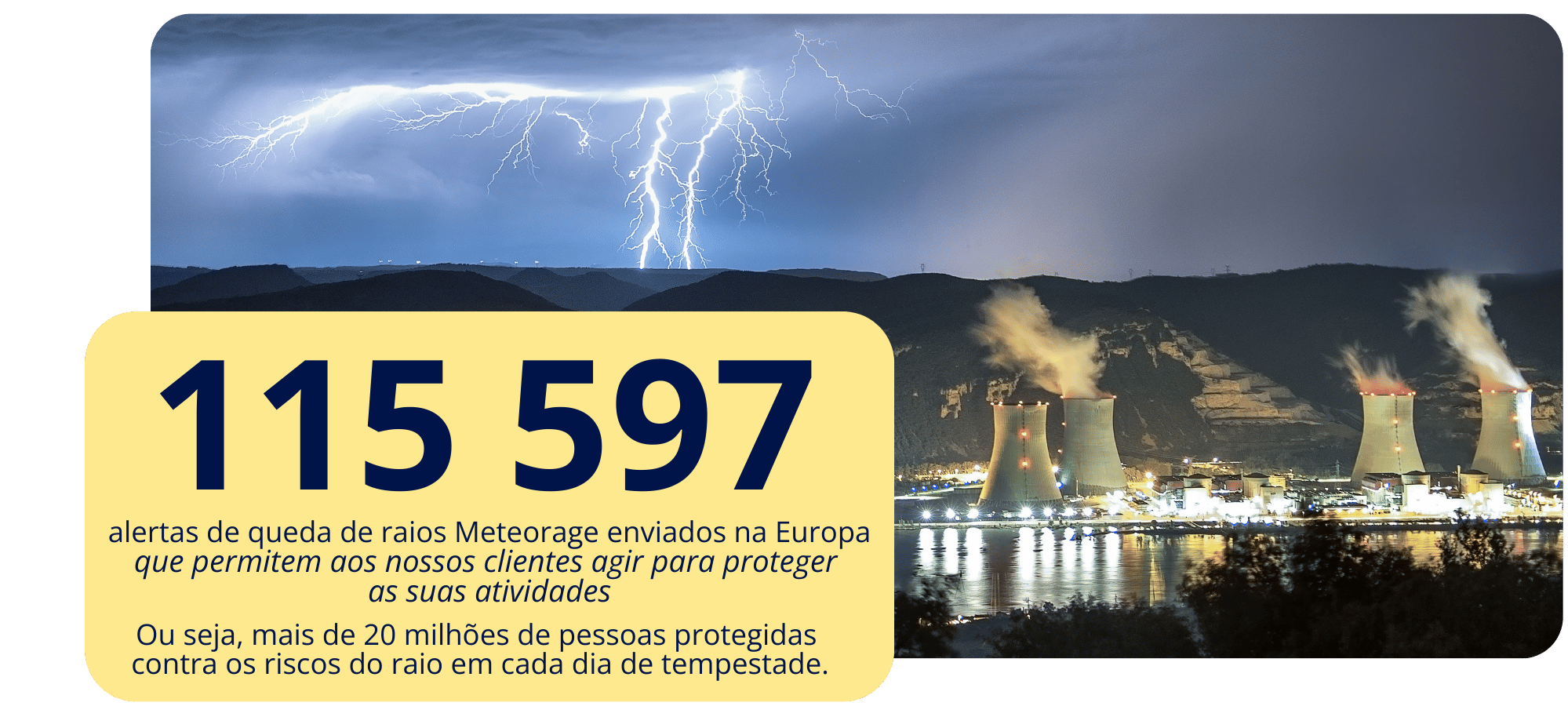 Na Meteorage, especialista em deteção da queda de raios há cerca de 40 anos e operadora de uma rede europeia de referência, acompanhamos os nossos clientes na antecipação, monitorização e gestão dos riscos de tempestade, através de soluções adaptadas a cada setor de atividade.
